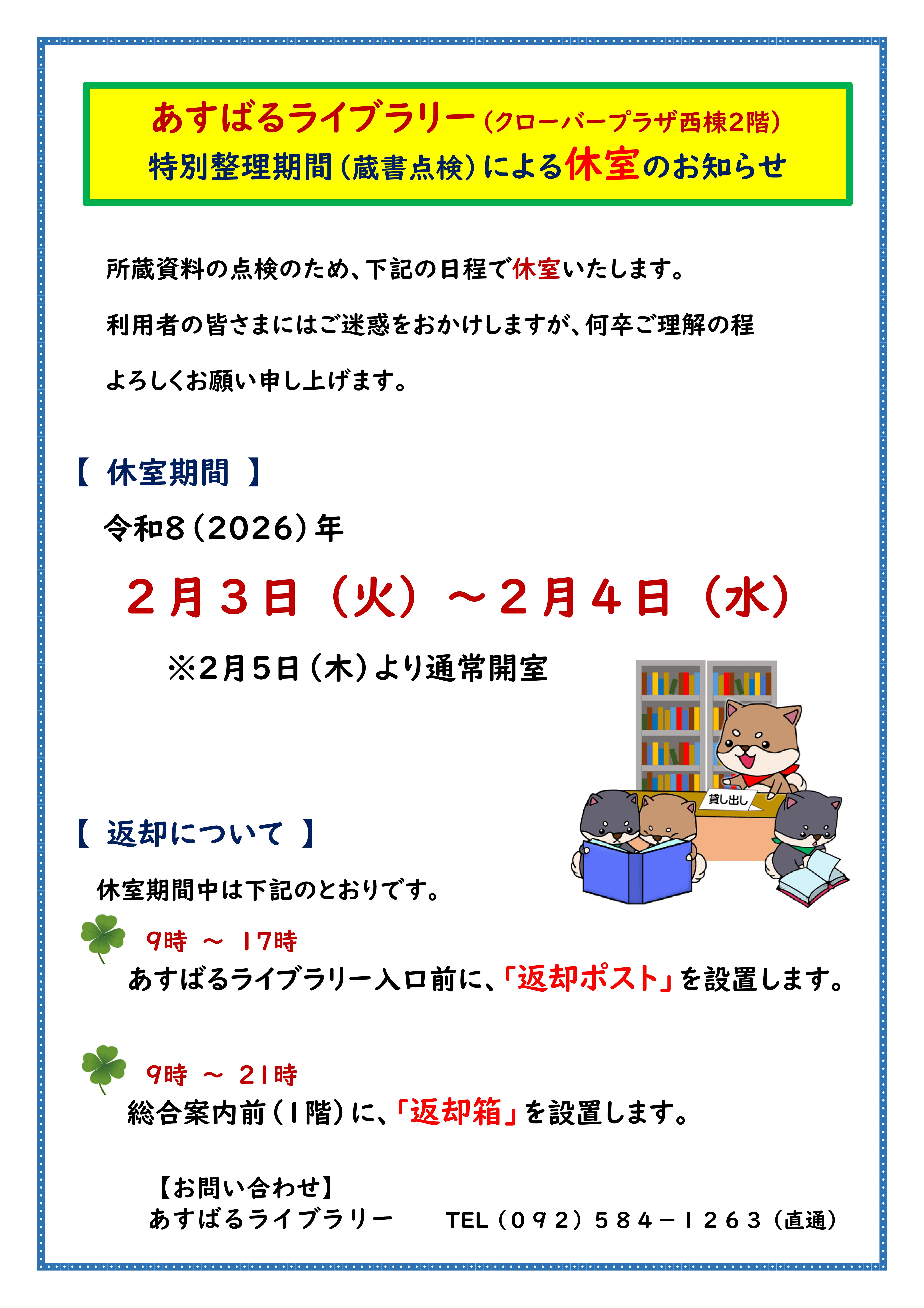 - 2026年2月3日・4日の両日、あすばるライブラリーは蔵書点検のため休室となります。2月5日から利用が可能です。(2026/01/28)